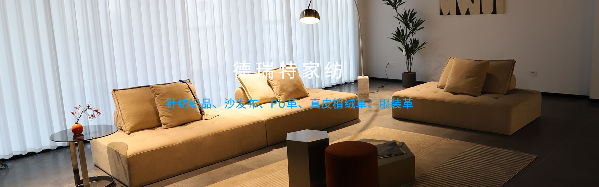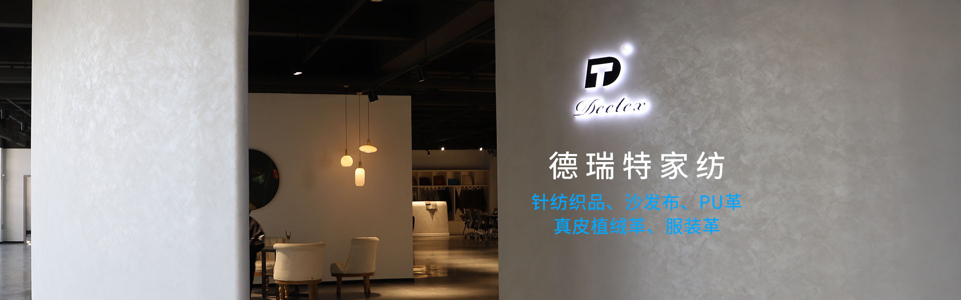 浙江德瑞特家纺科技股份有限公司是一家专业生产各类沙发布、汽车用布,真皮植绒皮的实体企业,企业生产各类针纺织品、沙发布、PU革、真皮植绒革、服装革等广泛用于沙发、汽车内饰、服装、箱包、制鞋、室内装饰等领域。 本公司以严谨的科学管理,先进的生产设备,成熟的工艺技术,优良的商业信誉,高品位的产品质量,热忱欢迎国内外新老客户的光临,加强业务合作,共图发展繁荣。